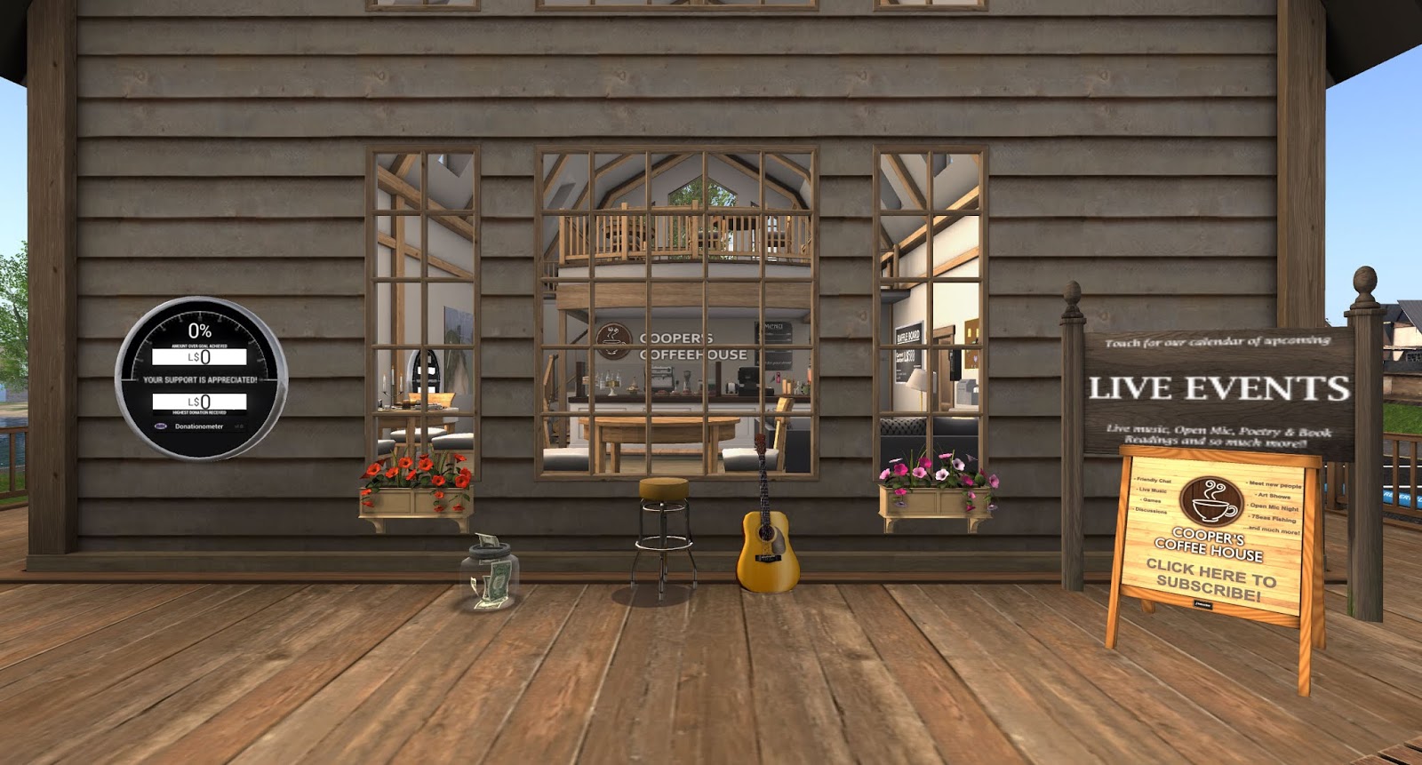 A free, nonprofit coffeehouse hangout for all residents of SL. All are welcome! Newbies, furries, kids, etc. Enjoy some free coffee, a variety of free rezzing boats, 7Seas Fishing, a Discussion area, board games, pool, Weekly live music and much more!